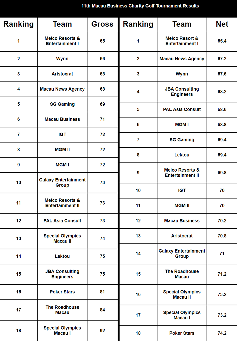 The balls are holed, the sun has set and the 11th Macau Business Charity Golf can be announced a success. 18 teams from local businesses have participated in the competition and the results are as following -