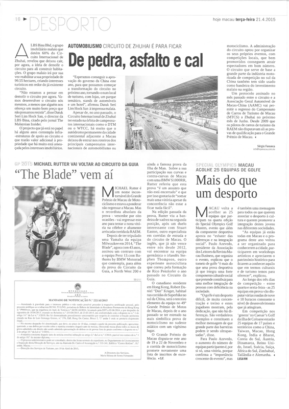 4-21-2015 - "Mais do que um desporto" Article in Hoje Macau Newspaper