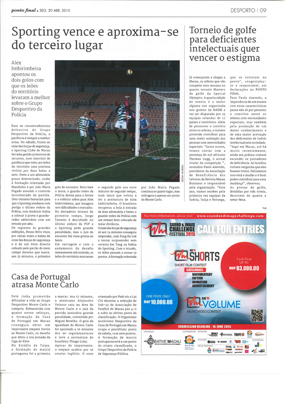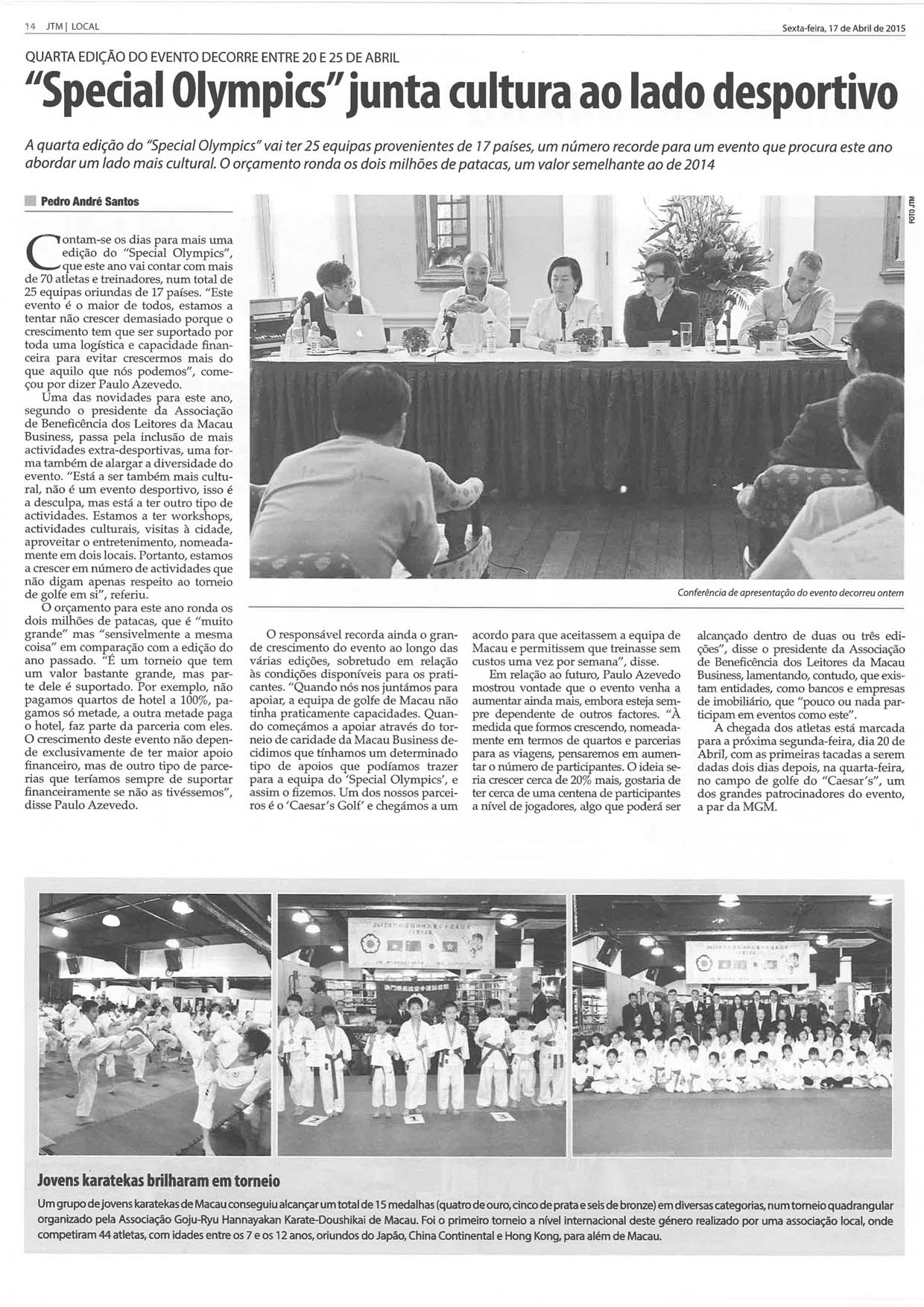 4-17-2015 - "Special Olympics junta cultura ao lado desportivo" published in Jornal Tribuna de Macau
