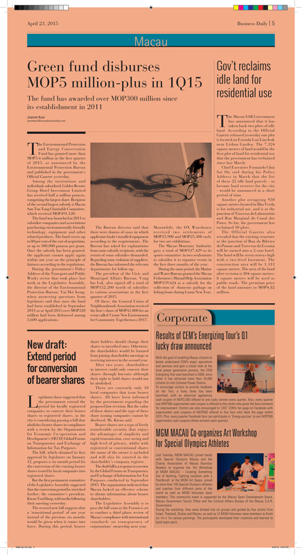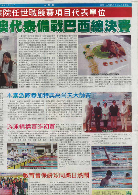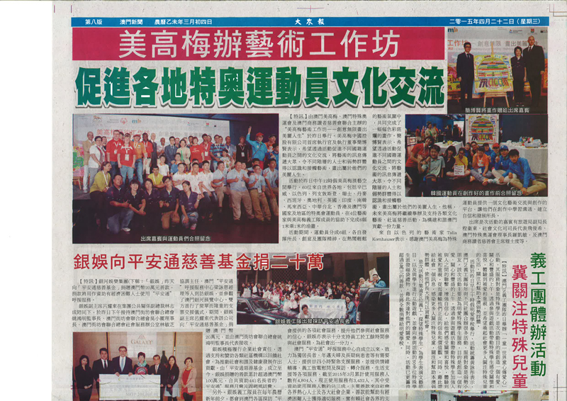 4-23-2015 - "MGM Macau Co-organizes Art Workshop for Special Olympics Athletes" published in Macau Business Daily