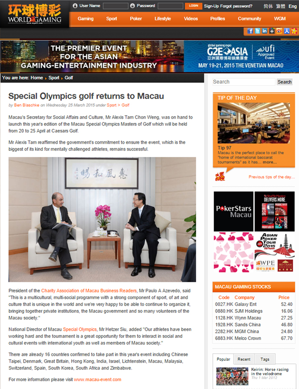03-25-2015 - "Macau Special Olympics Golf Masters returns to Macau" - published in the World Gaming Magazine (online edition)