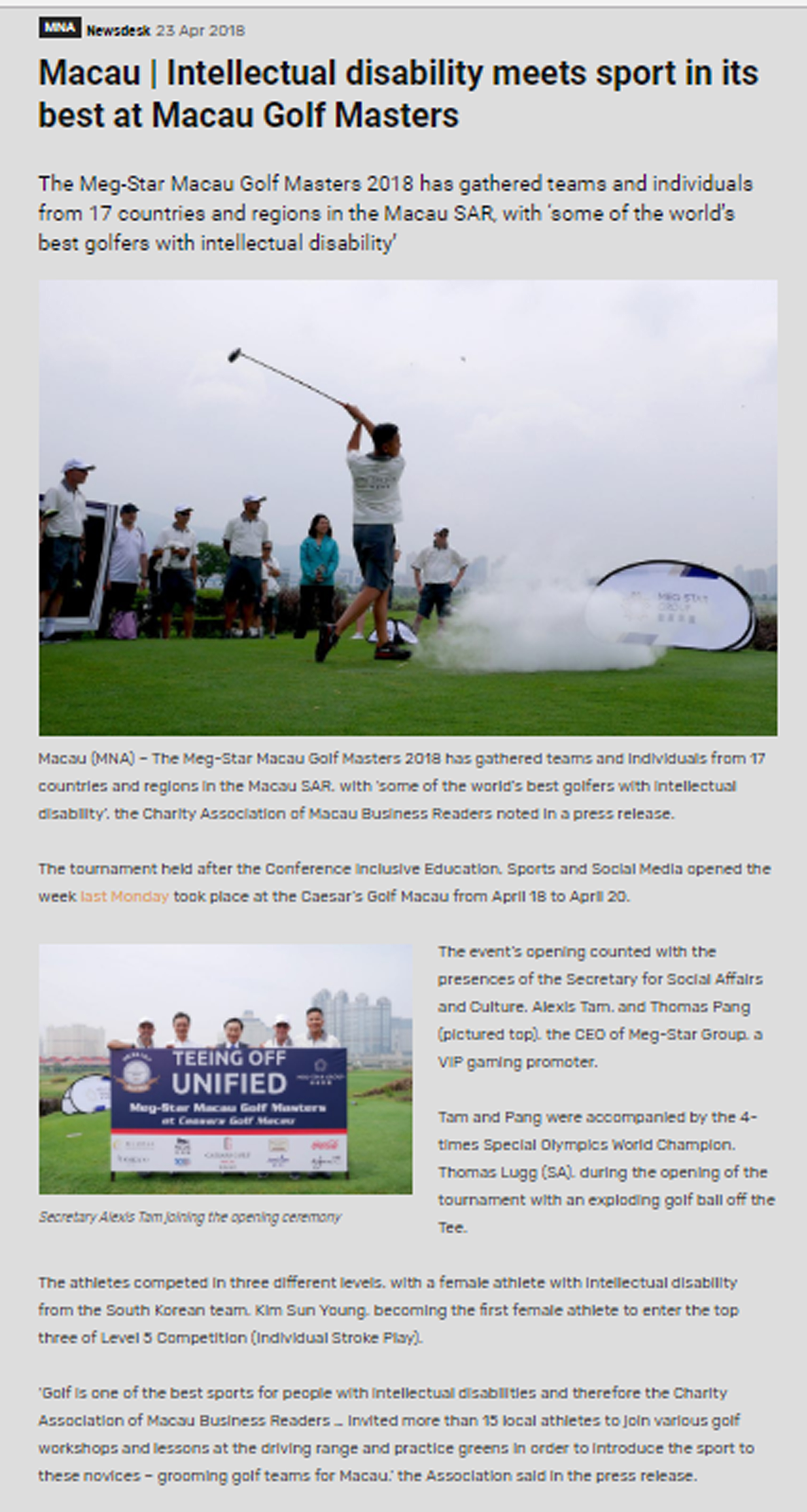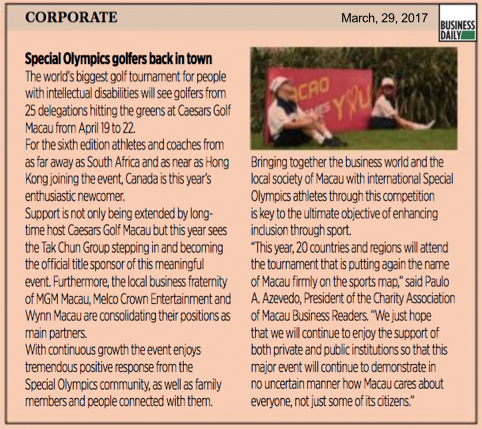 02-25-2016 - Press Release about the 2016 Macau Special Olmpics Golf Masters in Business Daily